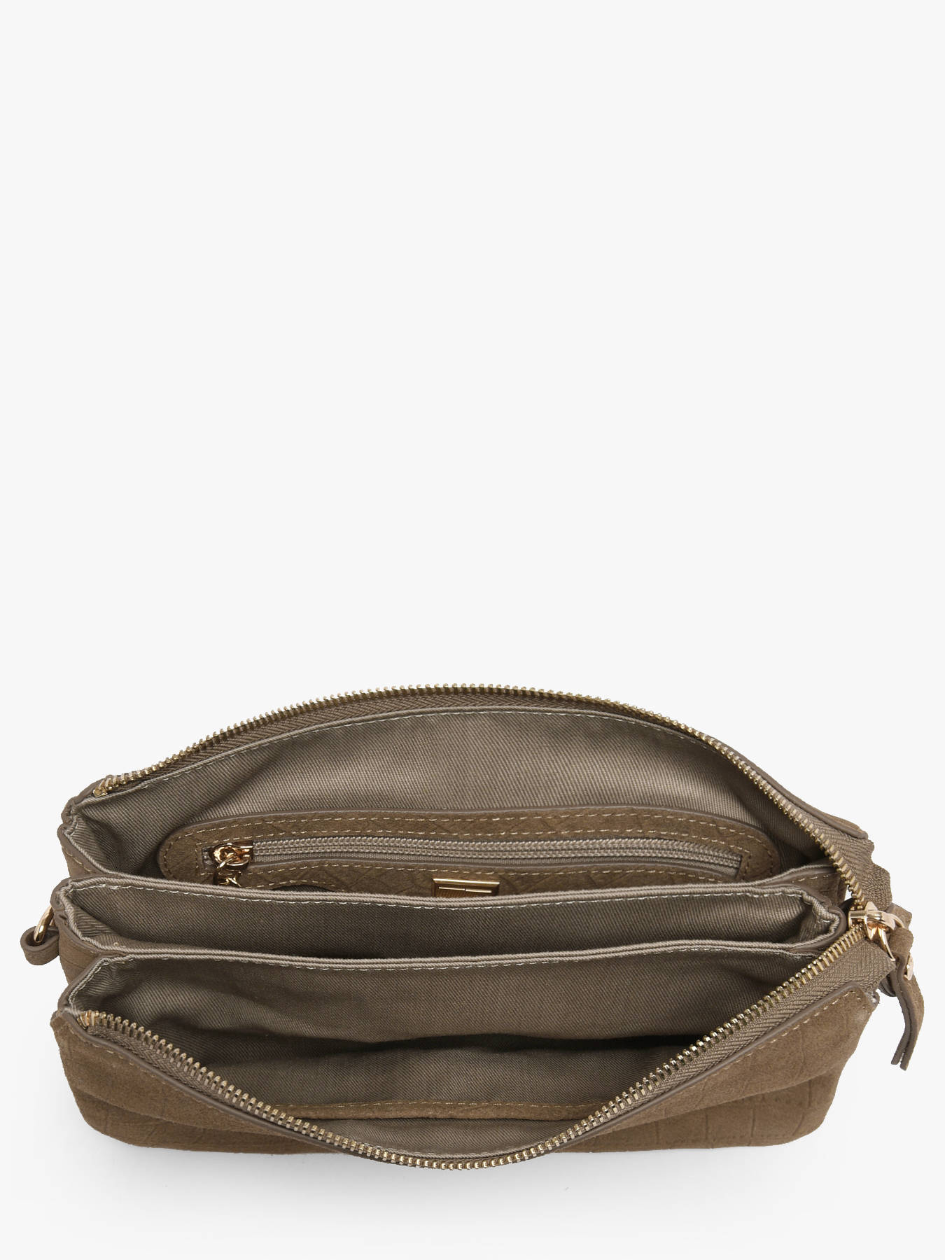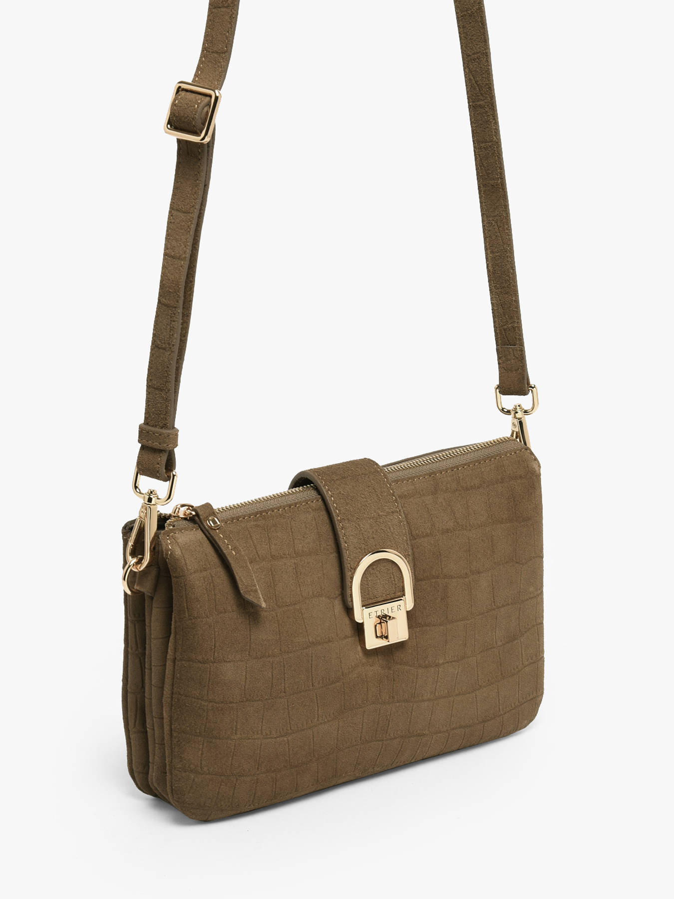 De cross body tas EQUESTRE CROCO van Etrier valt op door het suède rundleer met krokodillenprint, een gedurfde mix van texturen die elke tas verfijning en een wilde charme geeft. Deze tas combineert elegantie en functionaliteit met zijn ritssluiting, flap met sluiting en verstelbare, afneembare schouderriem, waardoor u hem op verschillende manieren eenvoudig kunt dragen. Binnenin bieden drie goed georganiseerde compartimenten ruimte om uw essentials netjes op te bergen, aangevuld met een eenvoudig vak en een ritsvak voor een betere indeling. De gouden afwerking geeft een verfijnde vleuje die deze tas nog mooier maakt, perfect voor wie tijdloze stijl wil combineren met een uitgesproken karakter. De Equestre Croco-tas is een echt juweel voor uw garderobe en ideaal om uw dagelijkse looks te begeleiden met een chique en wilde uitstraling.