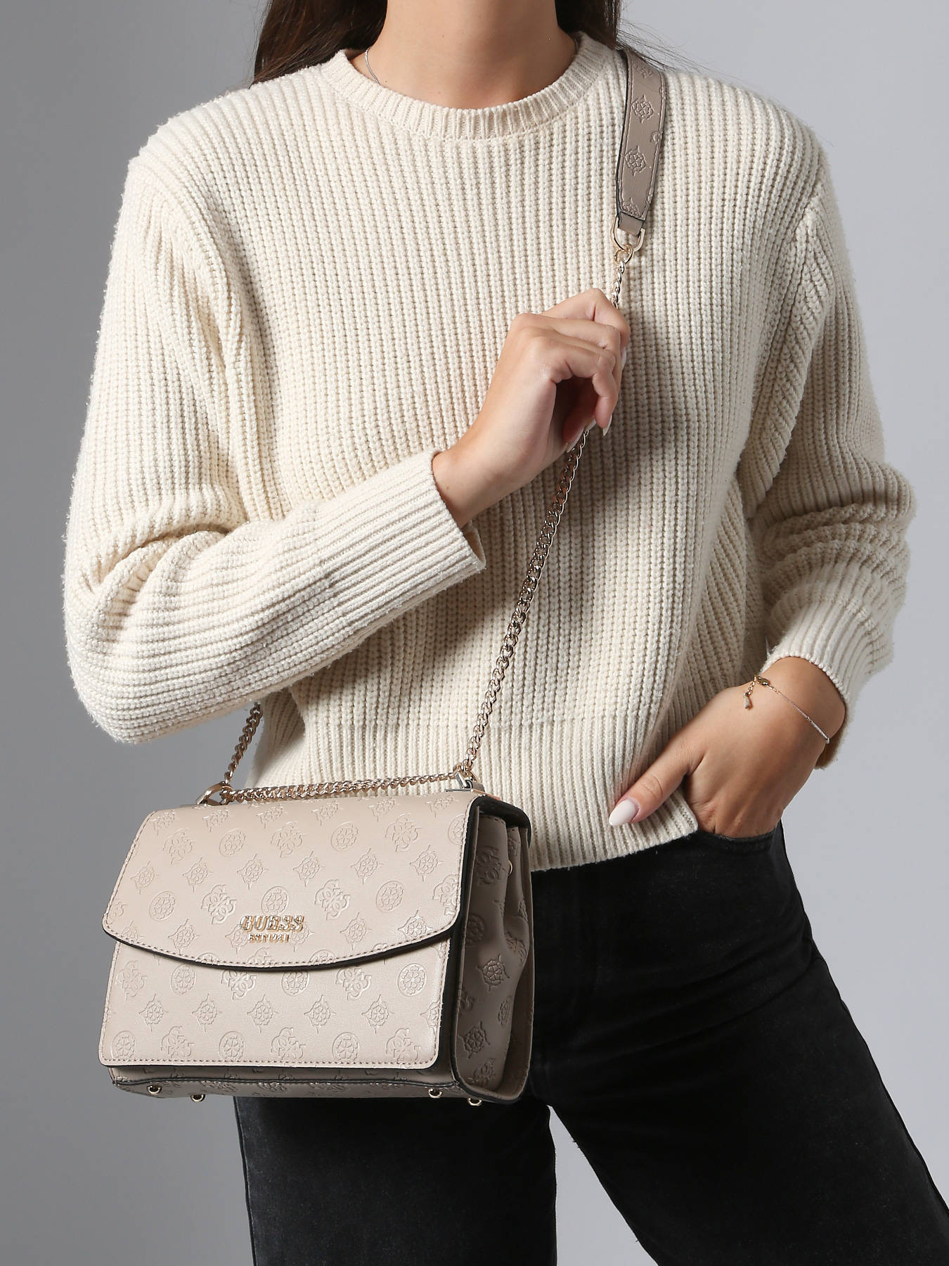De PHOEBE cross body tas van GUESS valt op door zijn chique en eigentijdse uitstraling, perfect om je dagelijkse outfits te complementeren. Gemaakt van gecoat canvas, combineert hij lichtheid, duurzaamheid en verzorgde afwerkingen voor een resultaat dat zowel elegant als functioneel is. De klep met magnetische sluiting voegt een moderne vleugje toe en zorgt voor snelle toegang tot je persoonlijke spullen. Een discreet vak aan de achterkant biedt ruimte voor je kleine essentials. Het interieur is goed doordacht en bevat een ruim hoofdvak, een ritsvak, een eenvoudig vak en drie kaartvakken, voor een optimale organisatie. Dankzij de verstelbare schouderriem kan hij comfortabel over de schouder of cross body worden gedragen. De PHOEBE cross body tas van GUESS combineert stijl, functionaliteit en verfijning op perfecte wijze.
