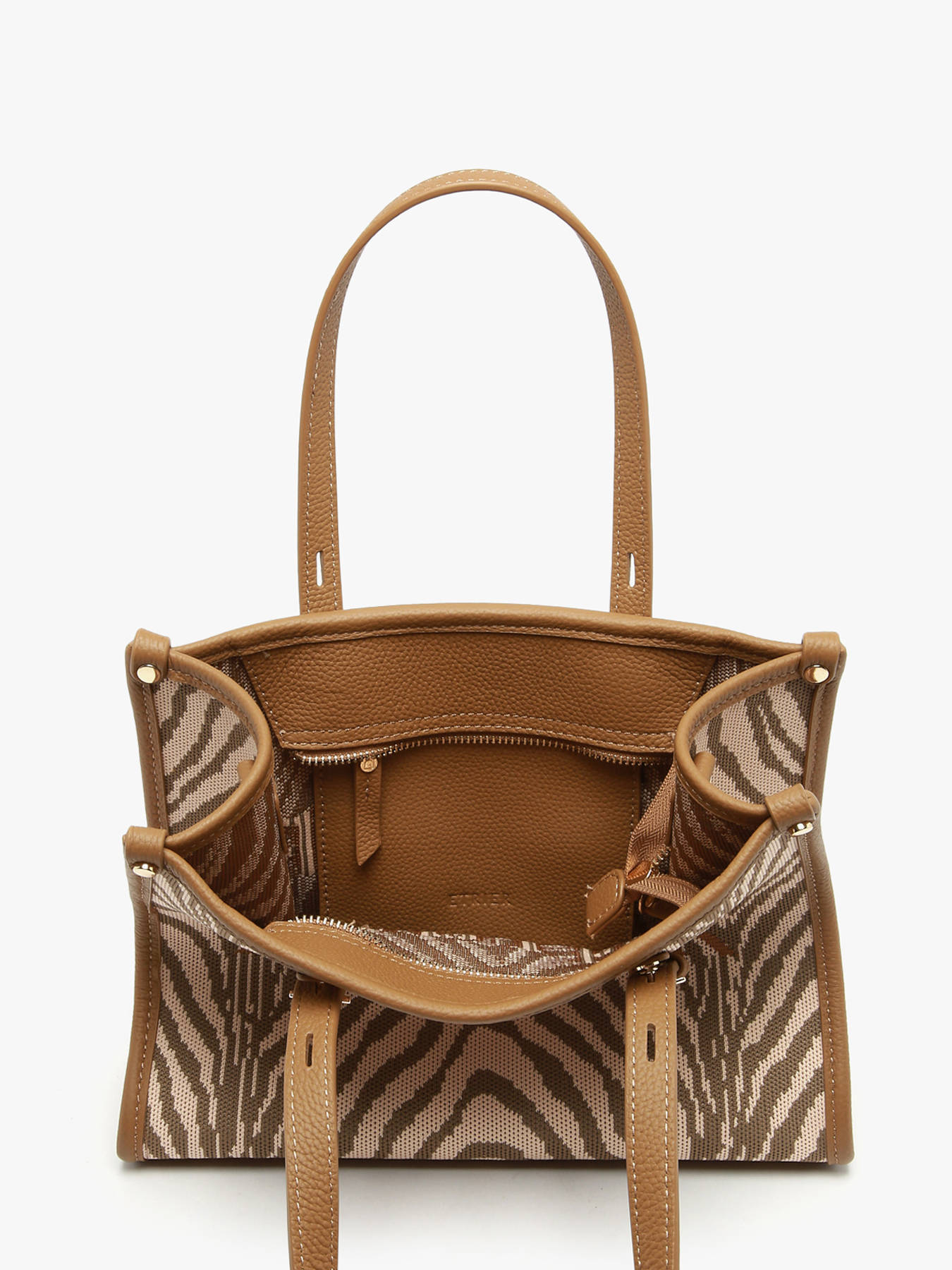 De mini cabas SAFARI van ETRIER vertaalt de gedurfde spirit van de lijn naar een compact en resoluut trendy formaat. Gemaakt van textiel en afgewerkt met leren details, onderscheidt hij zich door grafische dierenprints die zorgen voor een sterke en moderne stijl. Praktisch en licht, dit model in maat S draag je in de hand dankzij de handvatten van 16 cm of als cross body tas met de verstelbare en afneembare schouderriem, zodat hij zich aanpast aan al je wensen. De ritssluiting zorgt voor de veiligheid van je essentials, terwijl een binnenvak met rits een georganiseerde opbergruimte biedt. Een stijlvolle en functionele mini cabas, ideaal om je zomerse dagen te begeleiden met karakter en elegantie.
