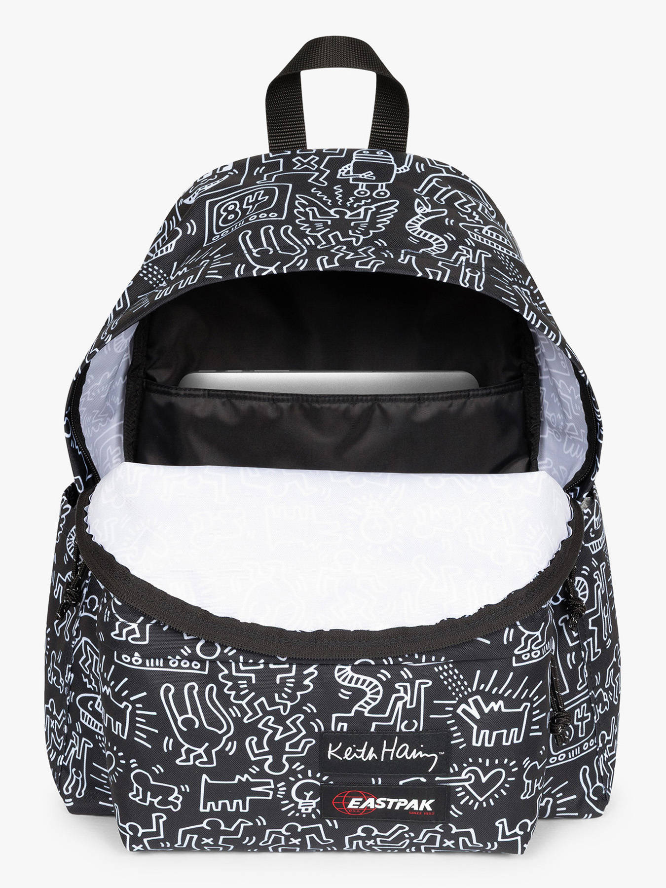 Rugzak 1 compartiment met 14" laptopvak van de lijn Eastpak x keithharing van Eastpak, om ofwel in de hand ofwel op de rug te dragen.